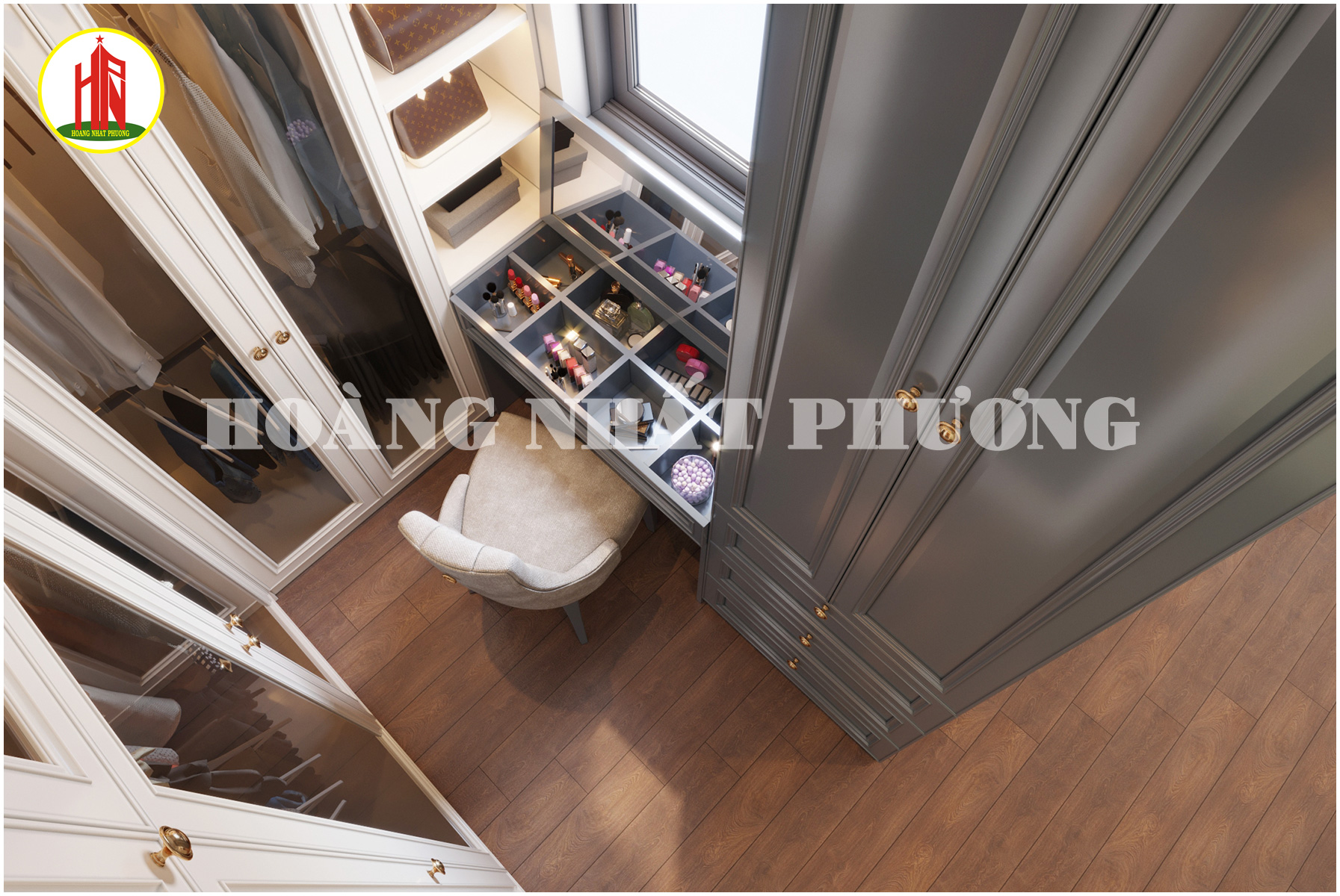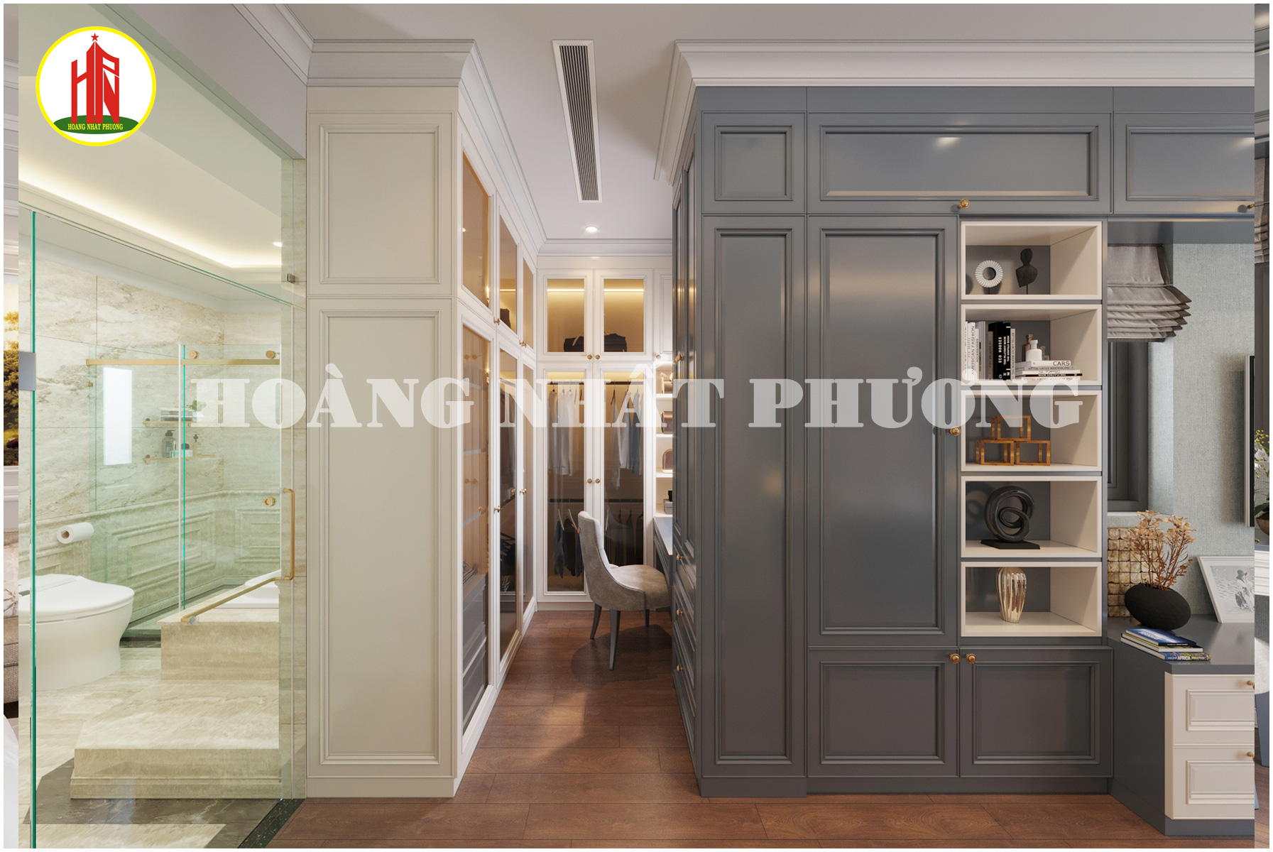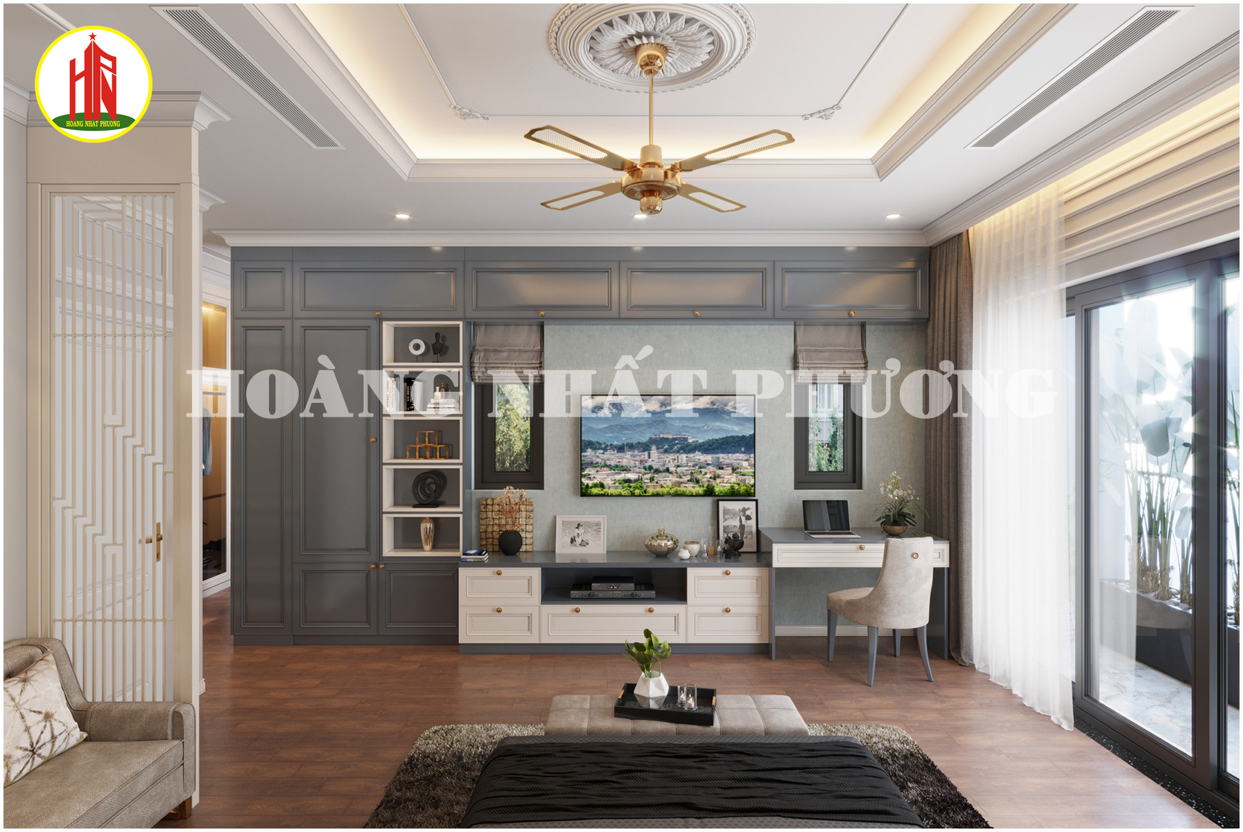 Phòng ngủ gia chủ được thiết kế nội thất theo phong cách tân cổ điển hoàn toàn đơn giản nhưng ai cũng phải khen đẹp khi nhìn vào. Lấy màu trắng và xám xanh làm chủ đạo, phòng ngủ gia chủ được thiết kế đầy đủ tiện nghi như 1 căn hộ thu nhỏ với 1 chiếc giường bọc nhung to lớn làm điểm nhấn cho cả căn phòng, 1 bộ sofa nhung nhỏ có thể nằm vừa người, hệ thống tủ tivi kịch trần kết hợp bàn làm việc và tủ trưng bày và 1 lối nhỏ rẻ vào là tủ áo kiếng áp trần chữ L cùng bàn trang điểm.