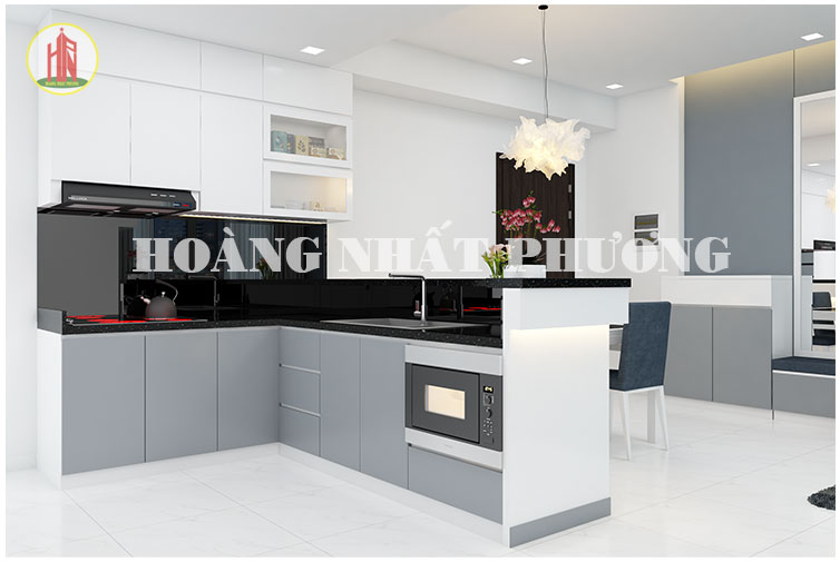 Thiết kế nội thất nhà bếp và phòng ăn sử dụng 3 màu chính là trắng, xanh xám và đen. Thiết kế tủ bếp hợp lý sự dụng màu xám xanh phần tủ bếp dưới tạo sự sạch sẽ và phần tủ bếp trên là tông trắng. Pha trộn chính giữa là mặt đá bếp đá hoa cương đen. Nhìn tổng thể thiết kế nhà bếp vừa đem lại sự hiện đại vừa giữ không gian bếp sạch sẽ.
