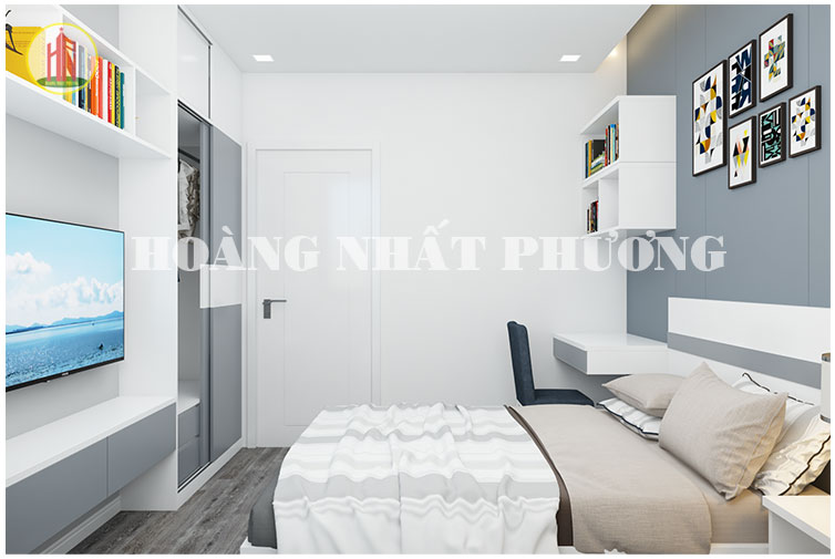 Thiết kế nội thất phòng ngủ số 2 cũng theo phong cách hiện đại. Không gian tuy nhỏ nhưng phòng ngủ 2 được thiết kế nội thất bố trí rất ấm cúng và tiện nghi, tận dụng hết không gian tường để thiết kế phức hợp đầy đủ nội thất như giường, tủ đầu giường, bàn học, tủ kệ tivi, tủ áo....