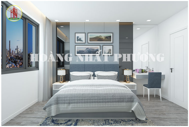 - Thiết kế nội thất phòng ngủ 1 theo phong cách hiện đại với gam màu xám xanh sang trọng. Vách đầu giường được cách điệu giữa kiếng đen và kiếng mờ, sự kết hợp mới lạ mang đến không gian phòng ngủ thời thượng. Dán sàn được dùng tông xám giúp căn phòng tông xuỵt tông ấm áp