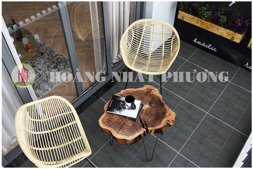 - Thiết kế nội thất ban công rộng rãi, bày trí 1 bàn cafe nhỏ tiện bàn công việc và hóng gió thư giản. Bên hông bố trí 1 máy giặt có thể giặt và phơi đồ ngay trong căn hộ officel