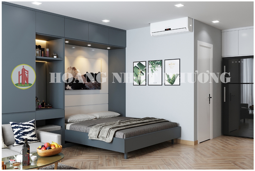 - Thiết kế nội thất phòng ngủ thông minh, chiếc giường rộng 1m8 x 2m có thể gập lên dính chặt vào tủ dễ dàng, căn hộ trở nên thật rộng rãi để làm việc