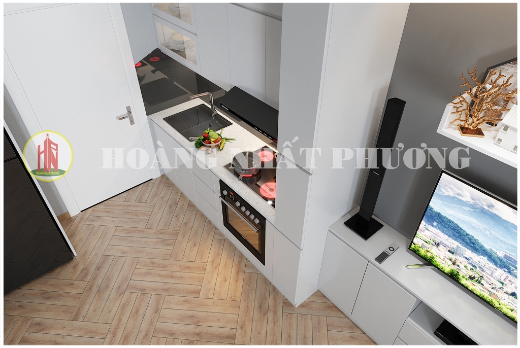 - Thiết kế nội thất nhà bếp đơn giản nhưng vẫn đầy đủ phục vụ nhu cầu nấu nướng. Thiết kế nội thất bếp hình chữ I vật liệu gỗ và mặt đá trắng, bếp được chia làm 2 tầng tiết kiệm không gian. Phần dưới được bố trí bếp điện âm, bồn rửa chén, hộp kéo tủ và 1 lò nướng âm. Phần trên là 1 dàn tủ treo dùng dể đựng chén bát và vật dụng cần thiết