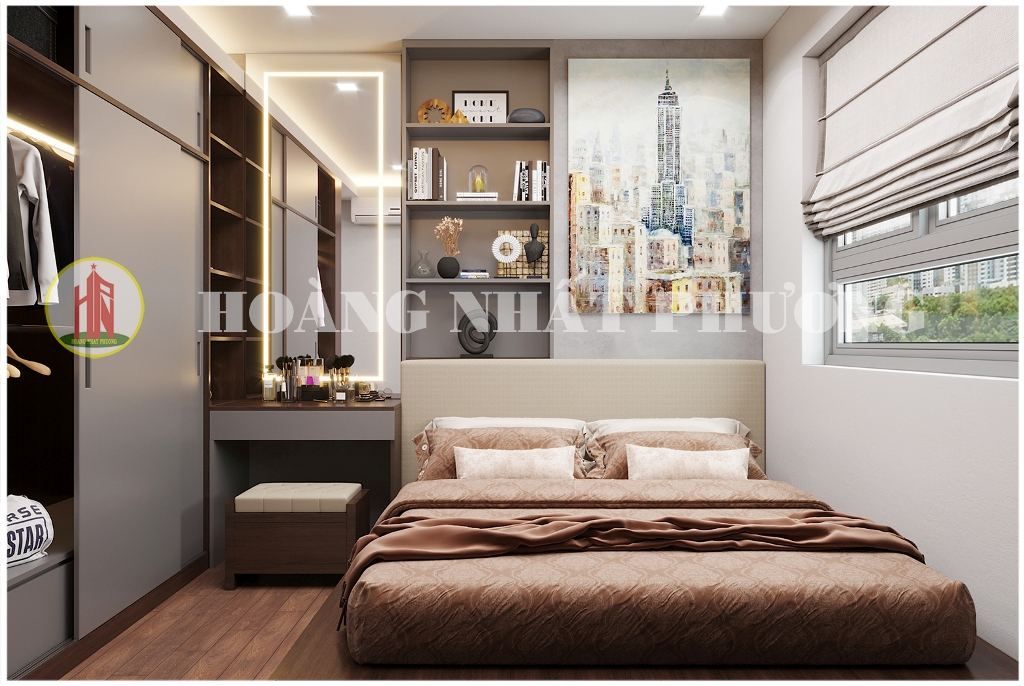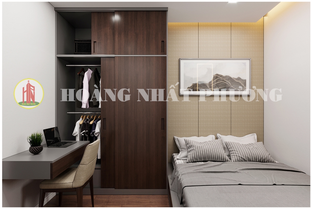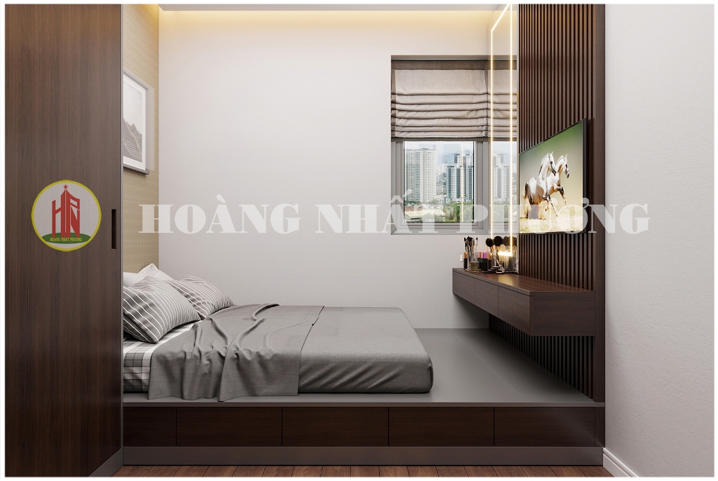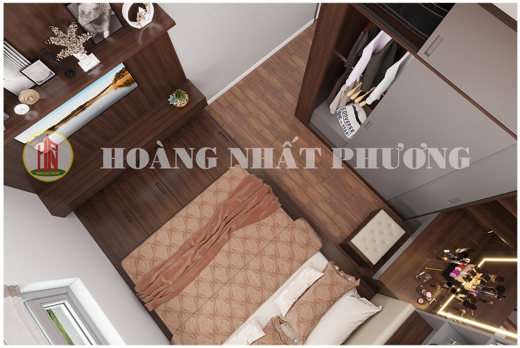 - Thiết kế nội thất phòng ngủ nhỏ được bố trí thông minh khắc phục điểm yếu về diện tích. Một bộ giường được kê sát cửa sổ, phía dưới giường là bộ tủ nhiều ngăn, phía trên giường là kệ tivi, tất cả nằm gọn 1 bên phòng. Bên cạnh giường là 1 tủ áo âm tường kịch trần và 1 bàn làm việc treo tường tiết kiệm diện tích