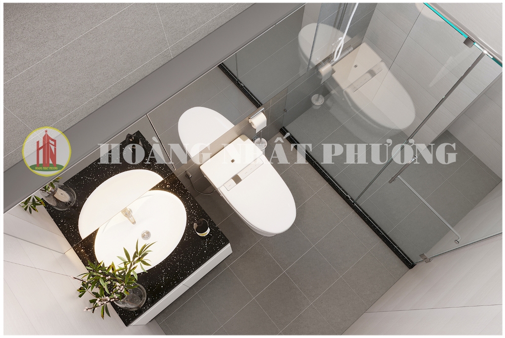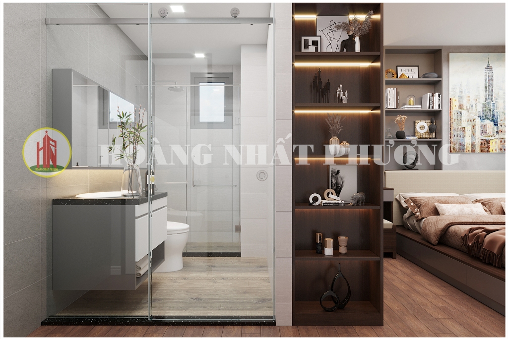 - Thiết kế nội thất phòng ngủ Master cũng theo 2 gam màu chính xám và nâu, với đầy đủ tiện nghi đáp ứng nhu cầu gia chủ gồm giường, tủ âm tường, kệ tivi, kệ trang trí, bàn trang điểm và 1 nhà vệ sinh có phòng tắm đứng tiện nghi