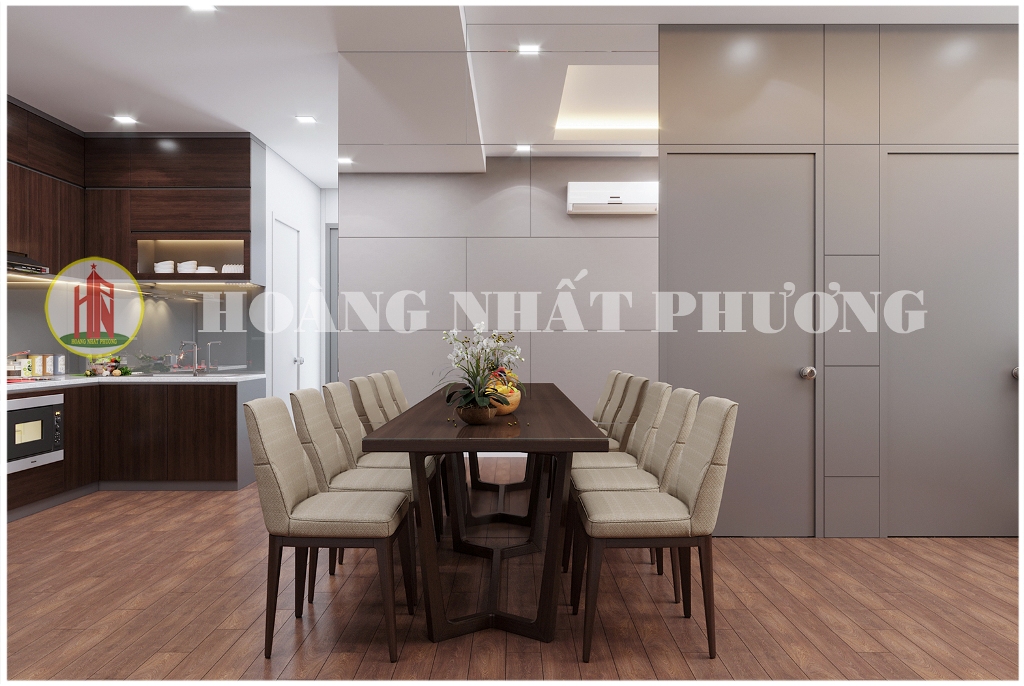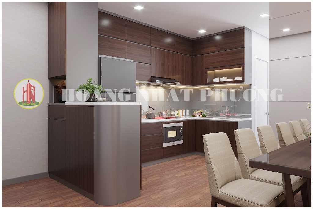 - Thiết kế nội thất nhà bếp đơn giản với tông gỗ nâu sang trọng, hệ thống tủ bếp kịch trần tiết kiệm diện tích nhưng đầy đủ thiết bị phục vụ nhu cầu nấu nướng. Bộ bàn ăn đặt gần khu vực bếp giúp việc dọn thức ăn sau khi nấu dễ dàng hơn