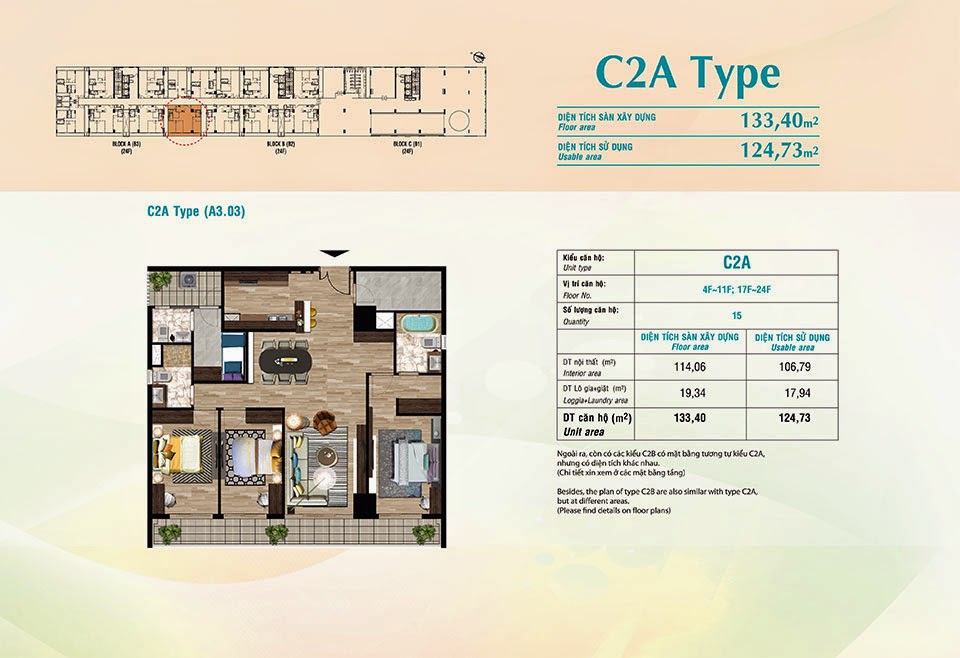 Thiết kế căn hộ bao gồm: 3 phòng ngủ, 2 phòng WC, 1 phòng khách, 1 phòng ăn, bếp, nơi giặt phơi đồ, ban công, cùng 1 số tiện ích khác.