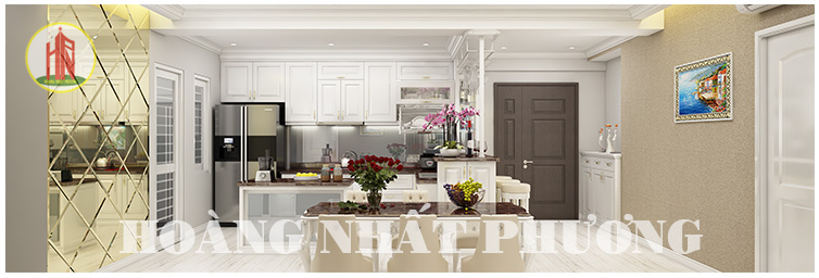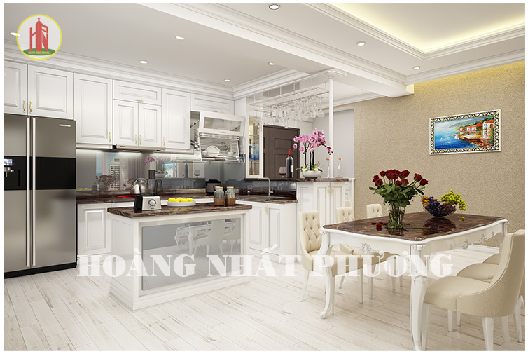 Thiết kế nội thất nhà bếp, phòng ăn và phòng khách được liên thông với nhau, tạo nên không gian mở rộng rãi. Nhà bếp kết hợp quầy bar bố trí gắn kết mang đến không gian sang chảnh cho gia đình và sự tiện nghi nhất định. Phòng ăn đẹp chỉ khi thiết kế tủ bếp đẹp và và thiết kế bàn ăn trang trọng, điều này sẽ giúp bạn cảm thấy bữa cơm của mình ngon miệng hơn cùng bên gia đình.