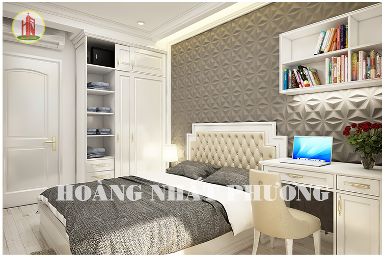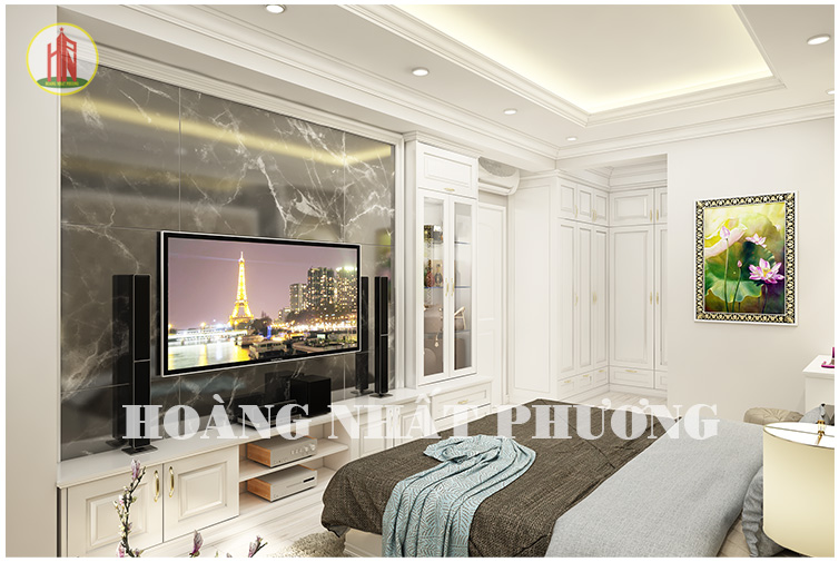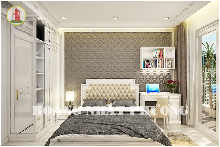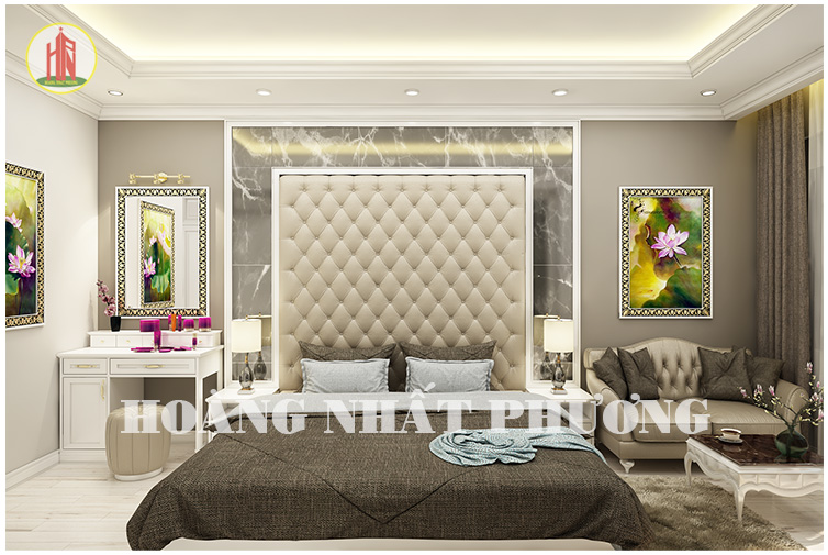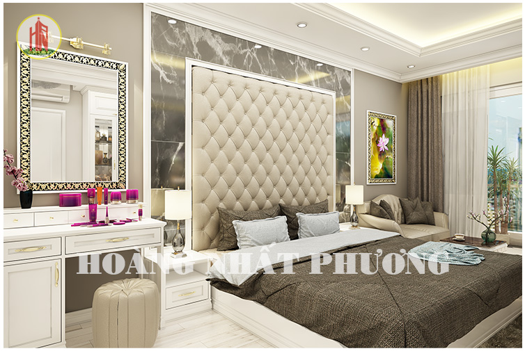 - Thiết kế nội thất phòng ngủ 1 theo phong cách cổ điển được trang bị với gam màu sáng rất bắt mắt, tông trắng là chủ đạo, các vật dụng nội thất giường ngủ, bàn trang điểm, tủ kệ, sofa...được thiết kế cùng phong cách chạm chỗ, các nút nhấn và chỉ chạy cổ điển tạo nên không gian quý phái và ấm áp cho phòng ngủ master